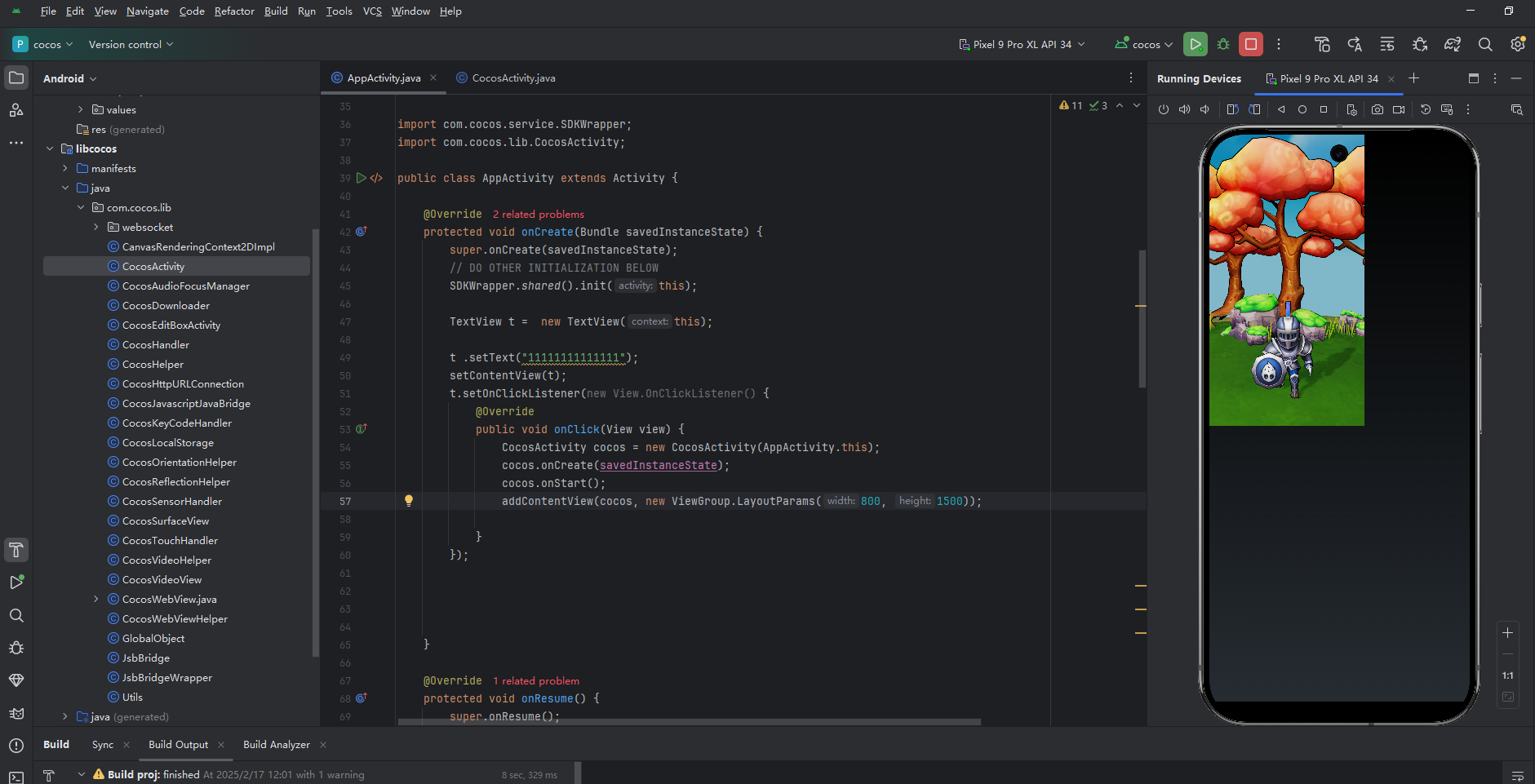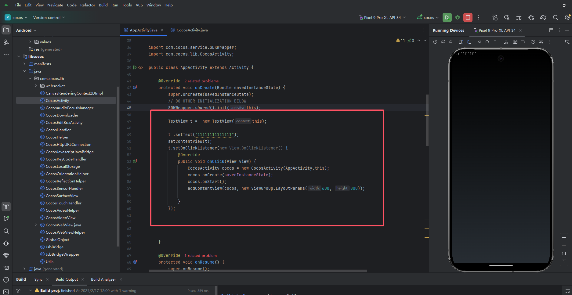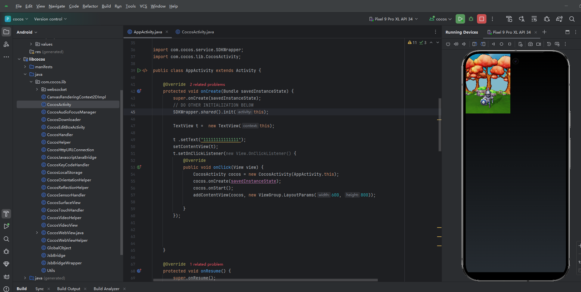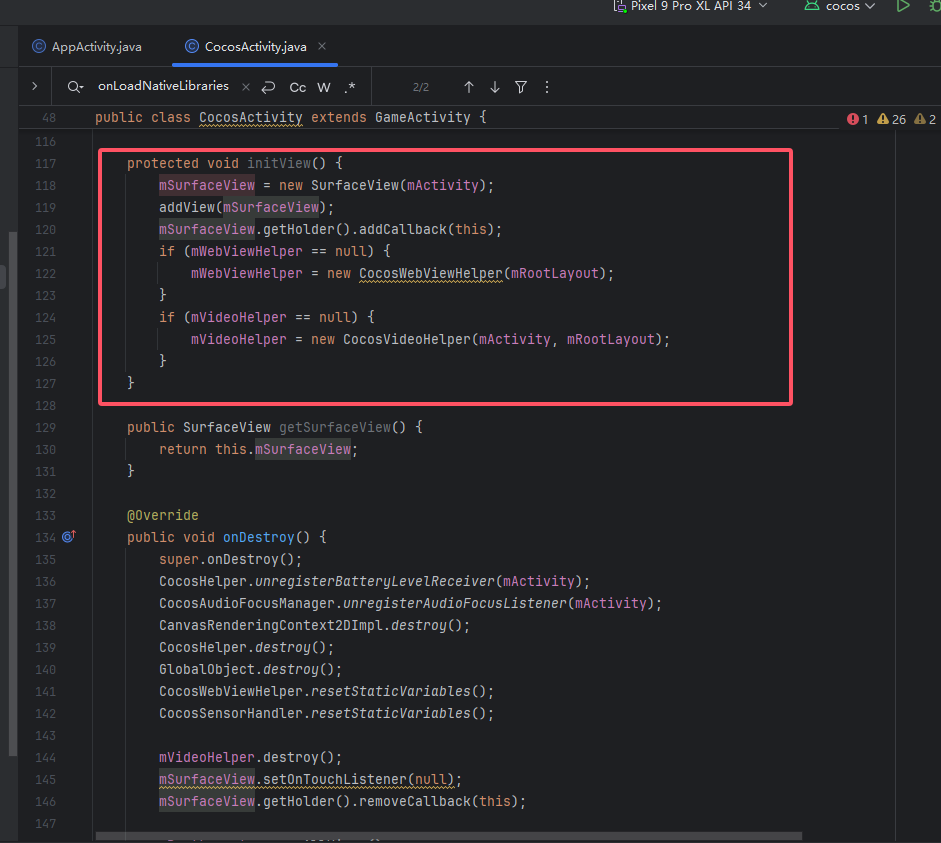 再接着,改一下CocosActivity initView函数,因为我把创建SurfaceView放到了CocosActivity来做。另外,有些地方会报 jni 错误,简单处理一下就好,这里就不多说了。