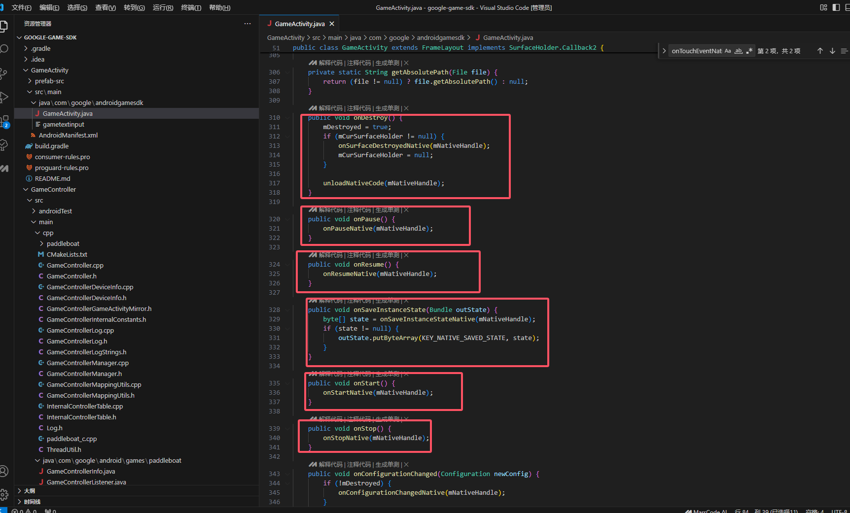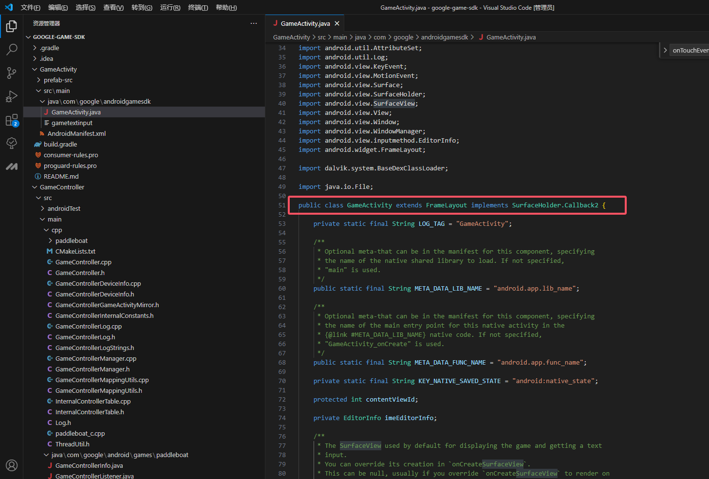 回到正题,我们只需要将GameActivity 继承 FrameLayout 或者 SurfaceView 就可以了。为了方便,我这里直接是继承 FrameLayout ,官方gamesdk 工程 地址:GitHub - cocos/google-game-sdk