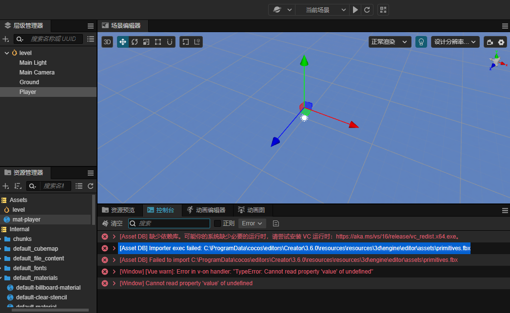 刚接触,准备从B站大神那里学学是什么样的,刚开始就出现这样的问题,player是方块,ground是地板,能锁定它们的位置,就是看不到,每次启动还会报错,请问是什么问题
