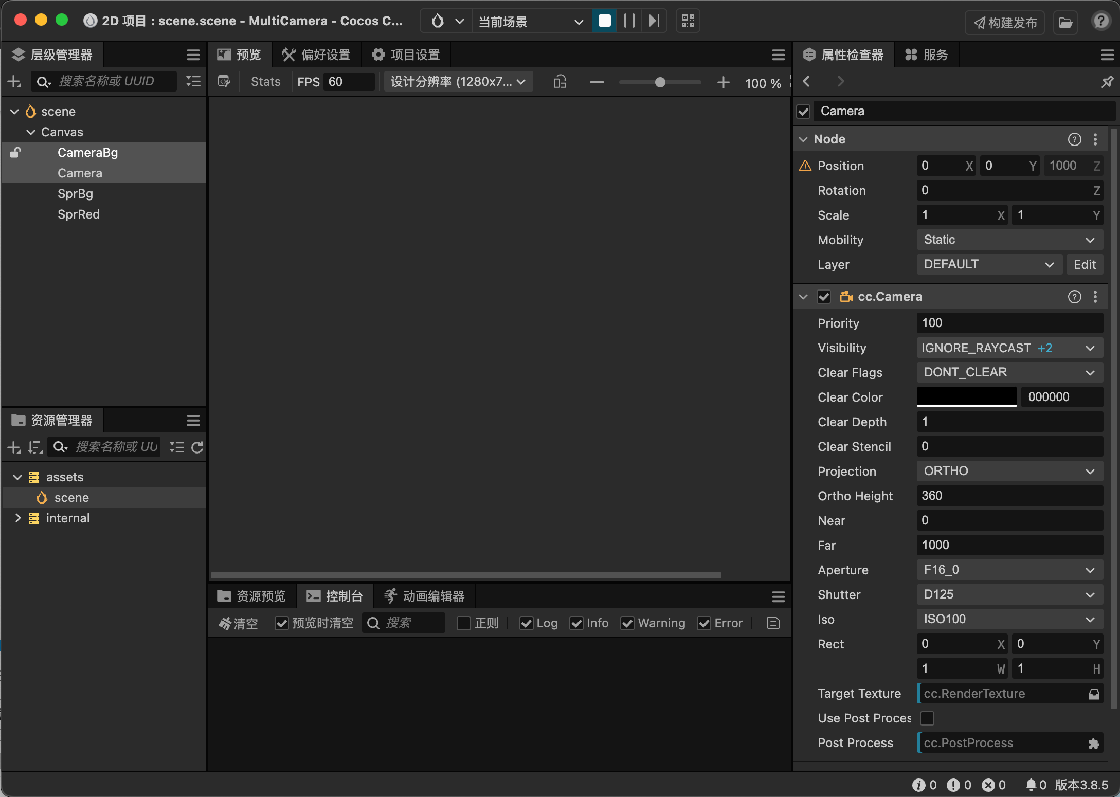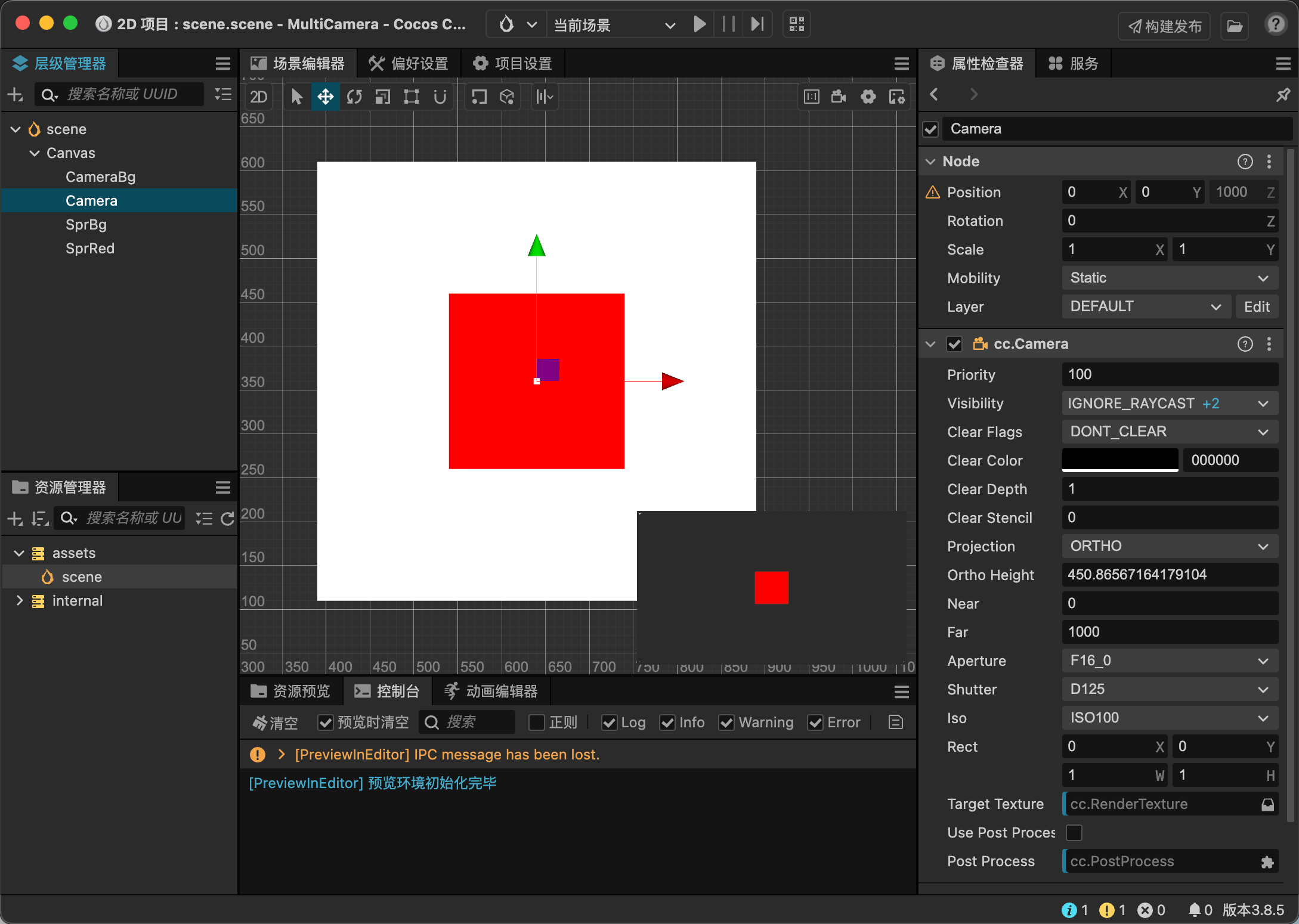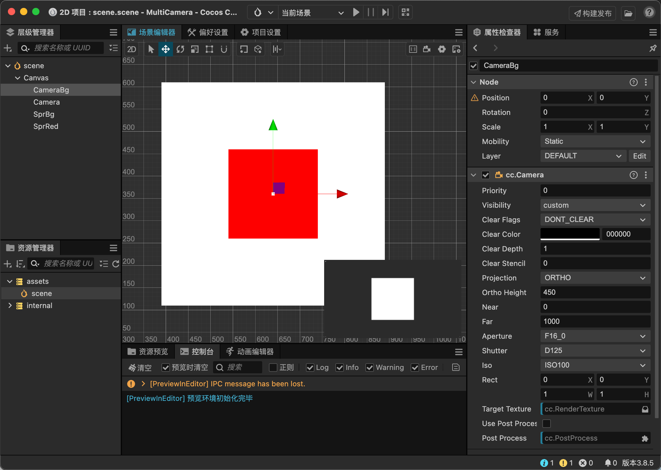 新建一个demo,除了默认的相机外再添加一个副相机,分别渲染两个精灵,编辑器预览下什么都显示不了。浏览器正常,3.8.2的时候也正常。