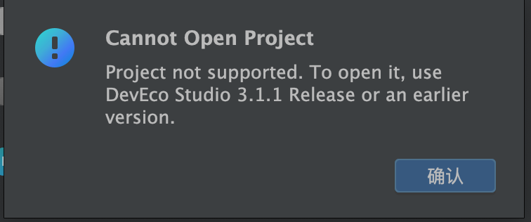 6、DevEco Studio打开项目,路径选择hmTest/native/engine/ohos/,出现报错1:Cannot Open Project Project not supported. To open it, use DevEco Studio 3.1.1 Release or an earlier version. 直接拖入DevEco Studio打开无法sync,无法运行。