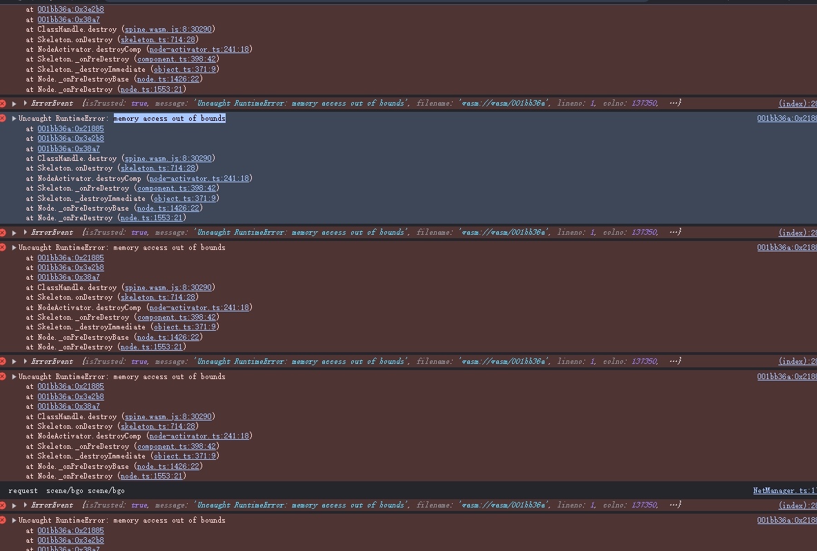 偶现Skeleton出现 memory access out of bounds报错,论坛有人说是因为动态设置skeletonData,但是我并没有动态设置skeletonData,也出现了这个错误,定位问题是出现在这行代码上: