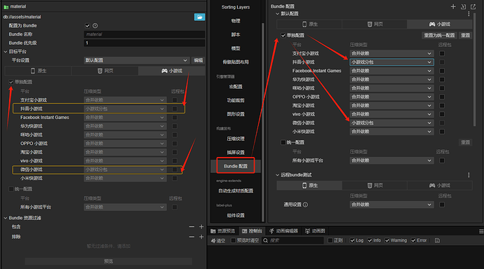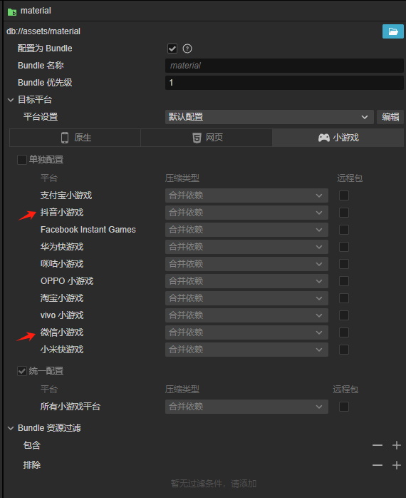 bundle 文件夹全部设置为小游戏分包压缩类型+构建面板不勾选初始场景分包+压缩类型小游戏子包