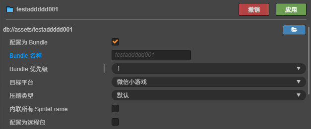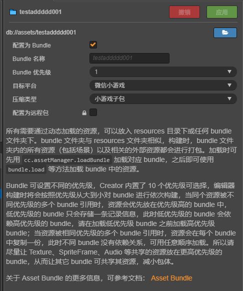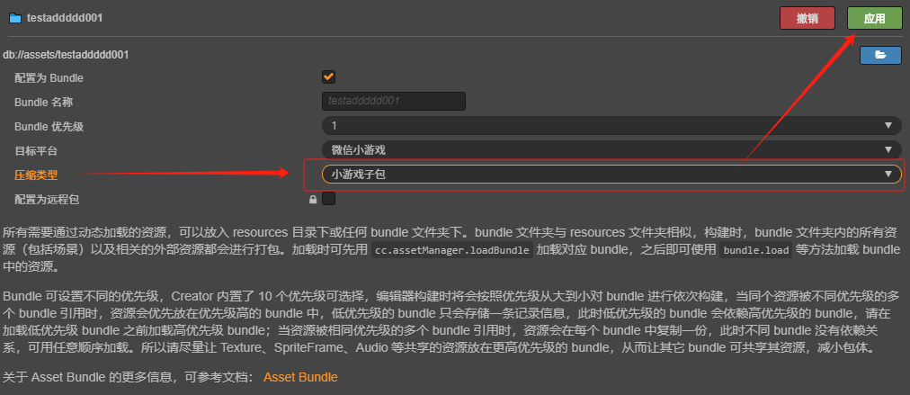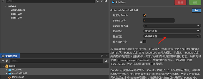 bundle 文件夹已勾选压缩类型为小游戏子包+ resources 文件夹默认压缩类型