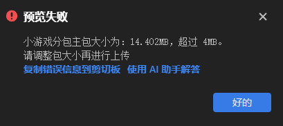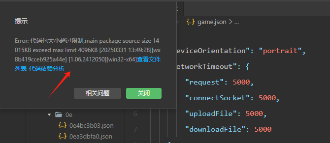 Error: 代码包大小超过限制,main package source size 14015KB exceed max limit 4096KB [20250331 13:49:28][wx8b419cceb925a44e] [1.06.2412050][win32-x64]查看文件列表代码依赖分析