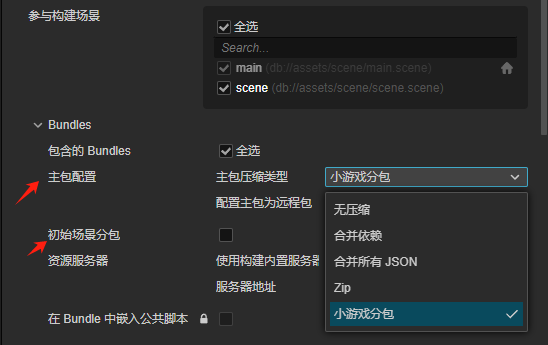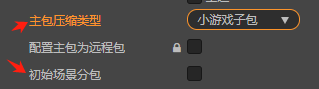 1. 构建面板选择小游戏分包压缩类型+不勾选初始场景分包