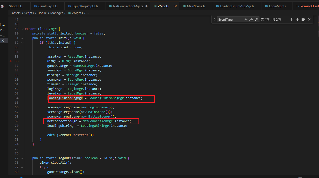 有两个类loadingFinishMsgMgr和netConnectionMgr打不进去bundle.js里面,已经确认过他们是同一个bundle里的脚本,有遇到过的大佬吗