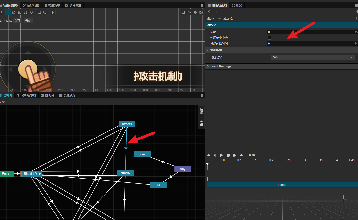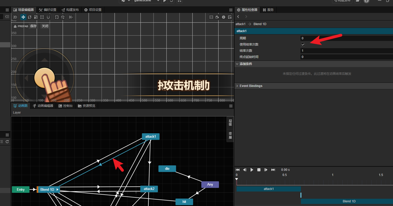求助大佬,attack1动作播放一半时。我直接设置切换到attack2动作。结果不生效。得等attack1动作播放完只会才播放attack2动作,如果我把图一的使用结束次数关了才可以被打断回到attack2动作。是不是bug呢?
