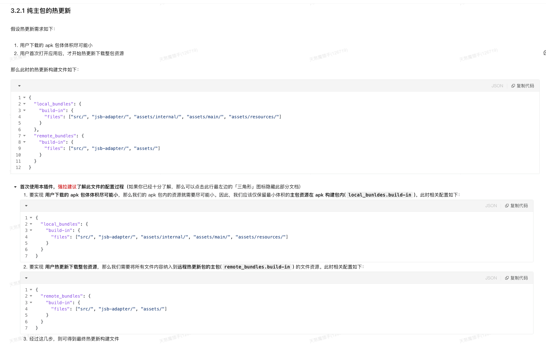 然后边玩边下,在project.manifest里面,给每个资源添加一个分组,在热更文件对比逻辑那边,根据分组去对比。例如我现在是分包2已经下载完成状态,那么热更的时候对比就是0,1,2组资源参与热更(0是包内资源组),其余资源等待运行时另外的下载流程,下载完成分包后增加完成状态步数就行。这个方案中本地包内和远程cdn上的manifest是一样的,都有带分组信息。