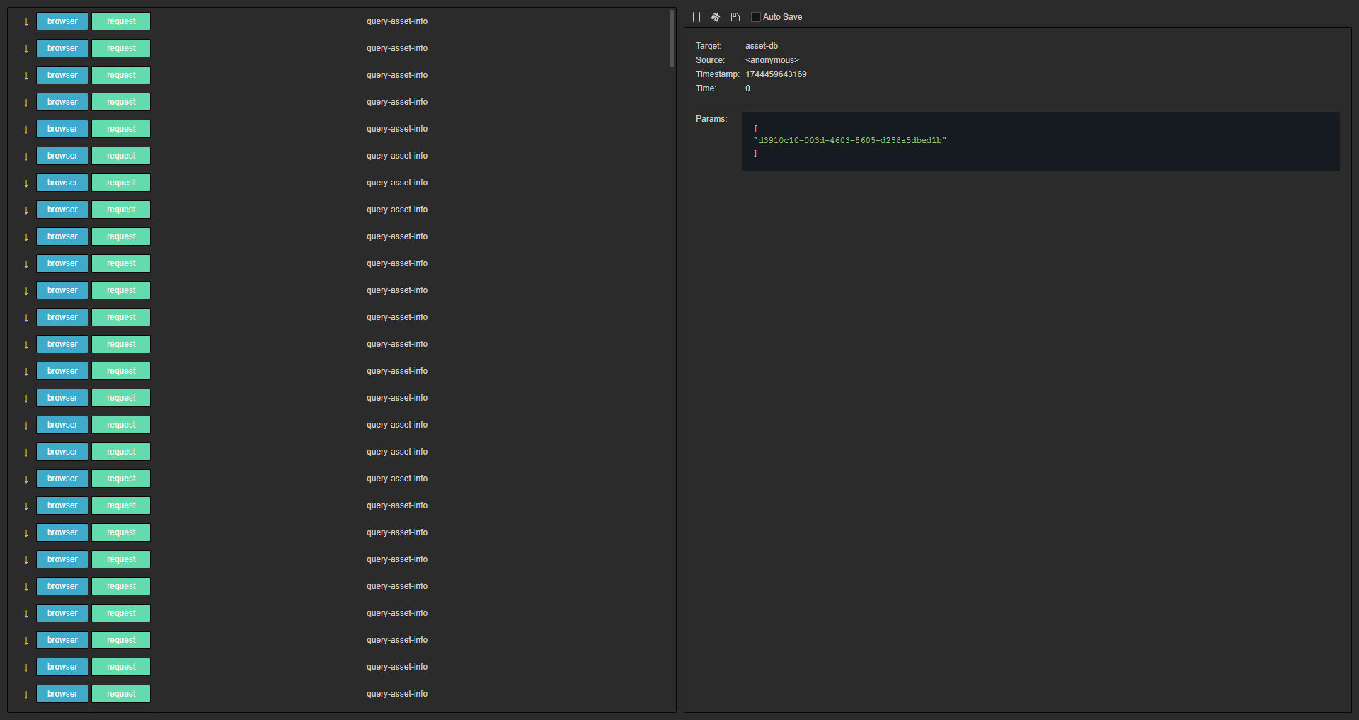 通过消息管理器可以看到拖拽上去以后会发送大量的query-asset-info消息,导致编辑器无法响应