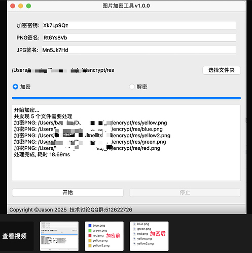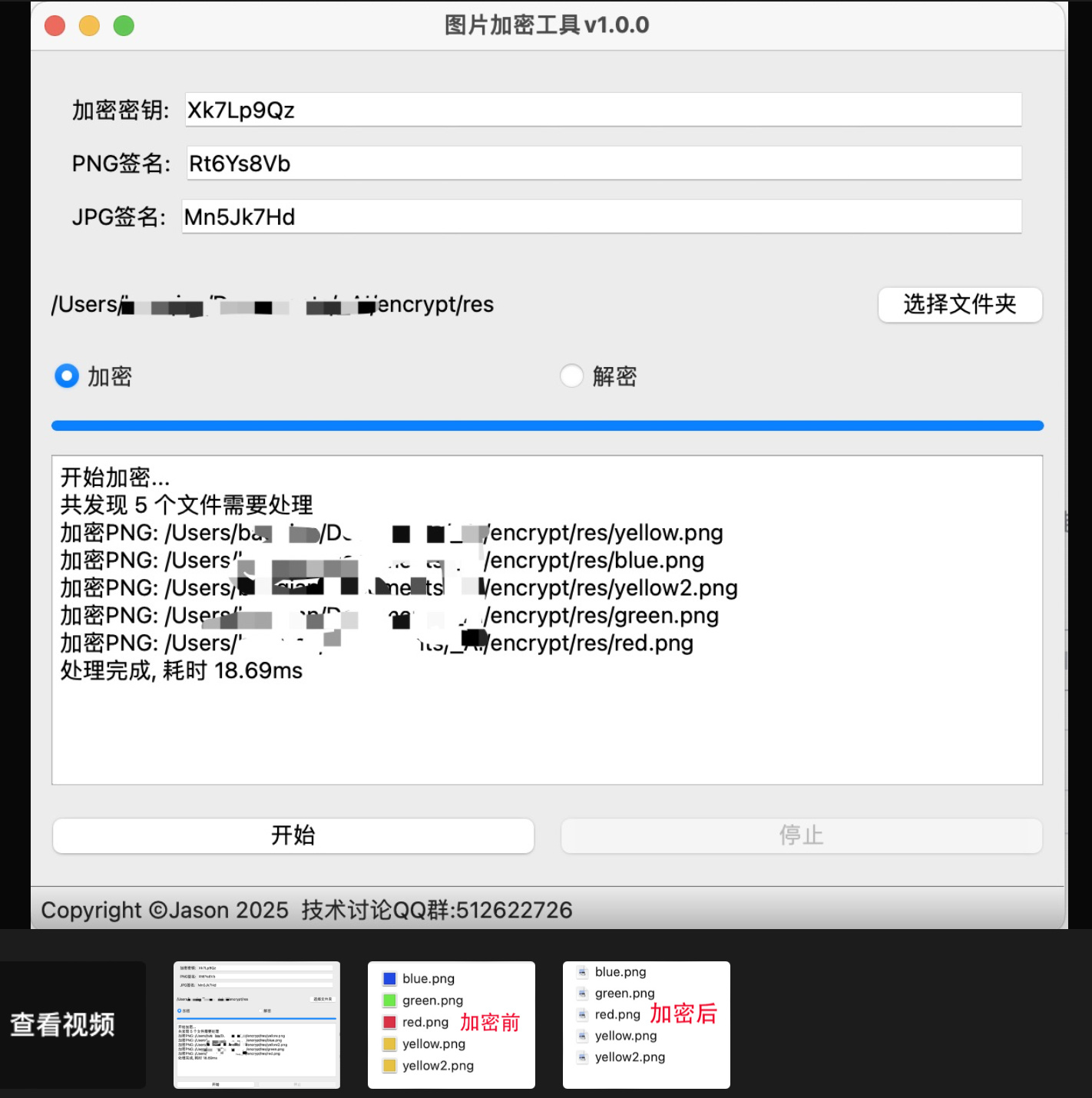 - 打开加密工具,选择构建后的图片资源目录,点击加密