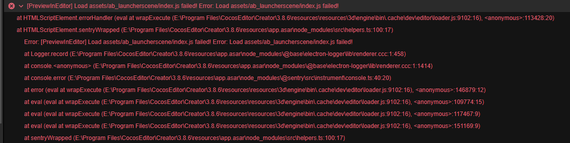 [PreviewInEditor] Load assets/ab_launcherscene/index.js failed! Error: Load assets/ab_launcherscene/index.js failed!