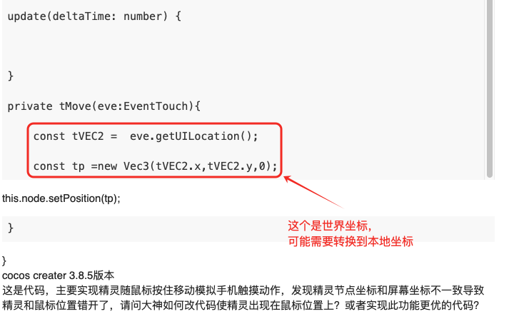 这是代码,主要实现精灵随鼠标按住移动模拟手机触摸动作,发现精灵节点坐标和屏幕坐标不一致导致精灵和鼠标位置错开了,请问大神如何改代码使精灵出现在鼠标位置上?或者实现此功能更优的代码?