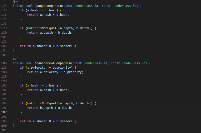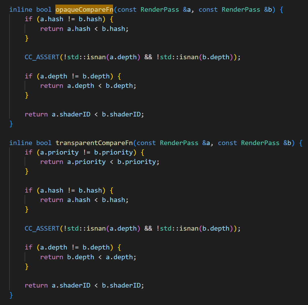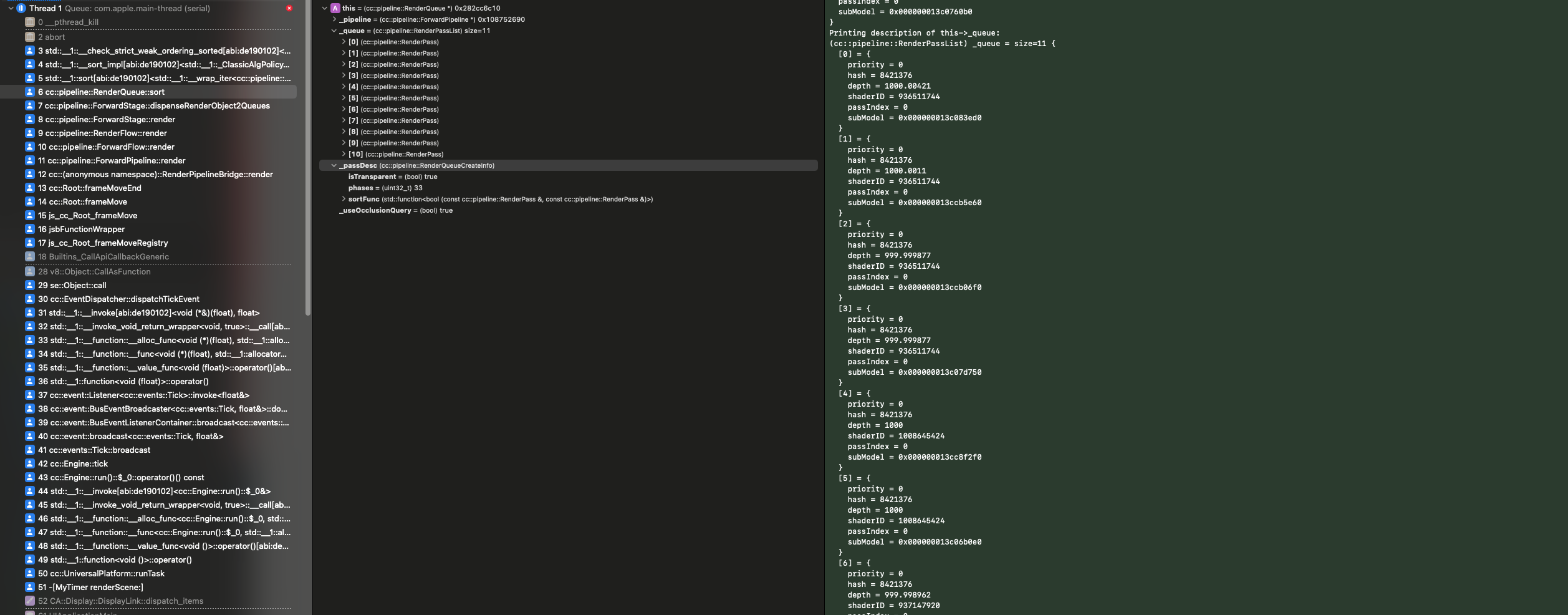 math::isNotEqualF在两个float相近的时候容易返回true,但问题不大。我这边碰到的问题是有一个粒子显示的时候这边renderQueue里有priority hash depth shaderID都一样但subModel不一样的,ios很容易崩溃,我这边准备在下面加一个拿subModel地址做比较来保底