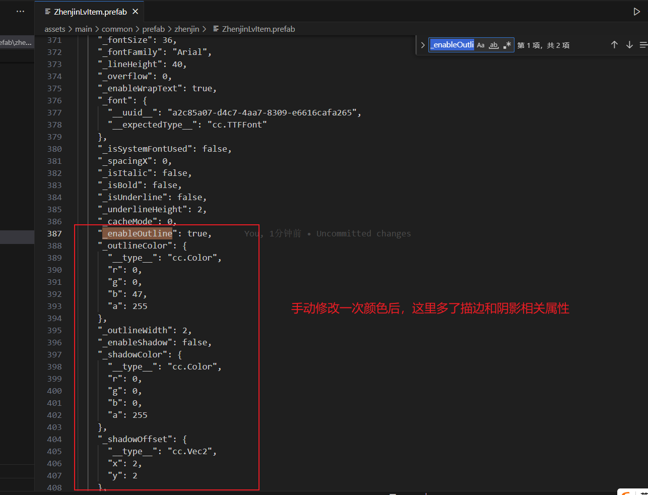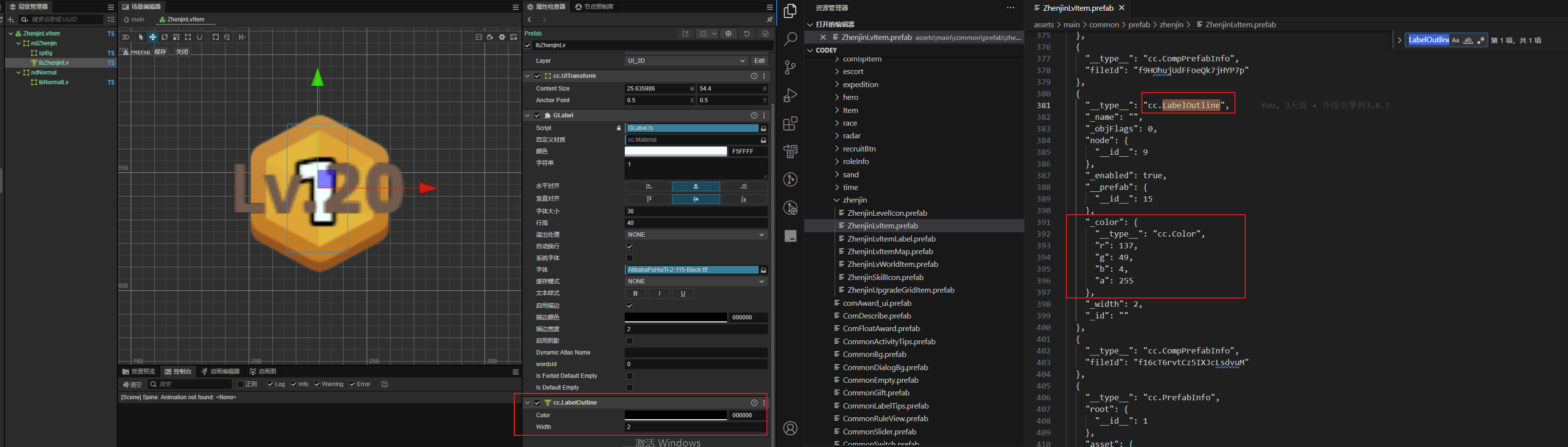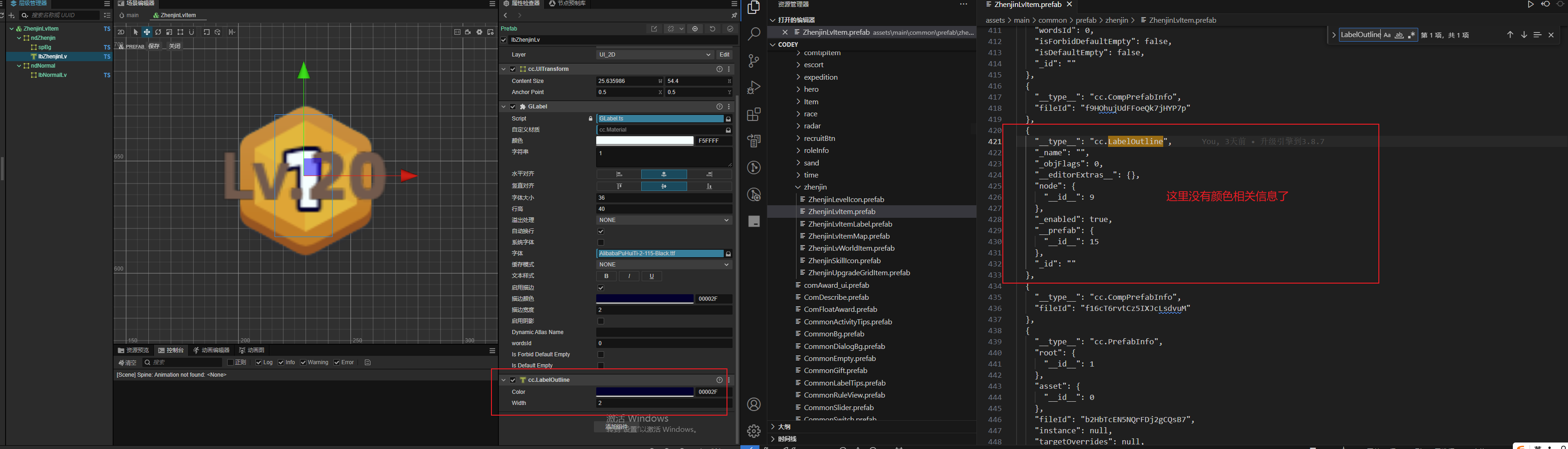 反馈个Bug,比较影响项目,从3.6.3升级上来,文本带了描边的,升级上来后很多都变成了纯黑色描边,但是实际预制体里面的labeloutline组件的颜色属性是对的,编辑器里面显示的是黑色;升级上来后发现Label组件新增的启用描边是已经正确勾选上了,但是预制体文件里面没有enableOutline属性相关内容,此时如果我手动修改LabelOutline组件颜色,对比前后预制体内容会发现,LabelOutline里面的颜色属性已经没了,Label里面多了enableOutline相关内容