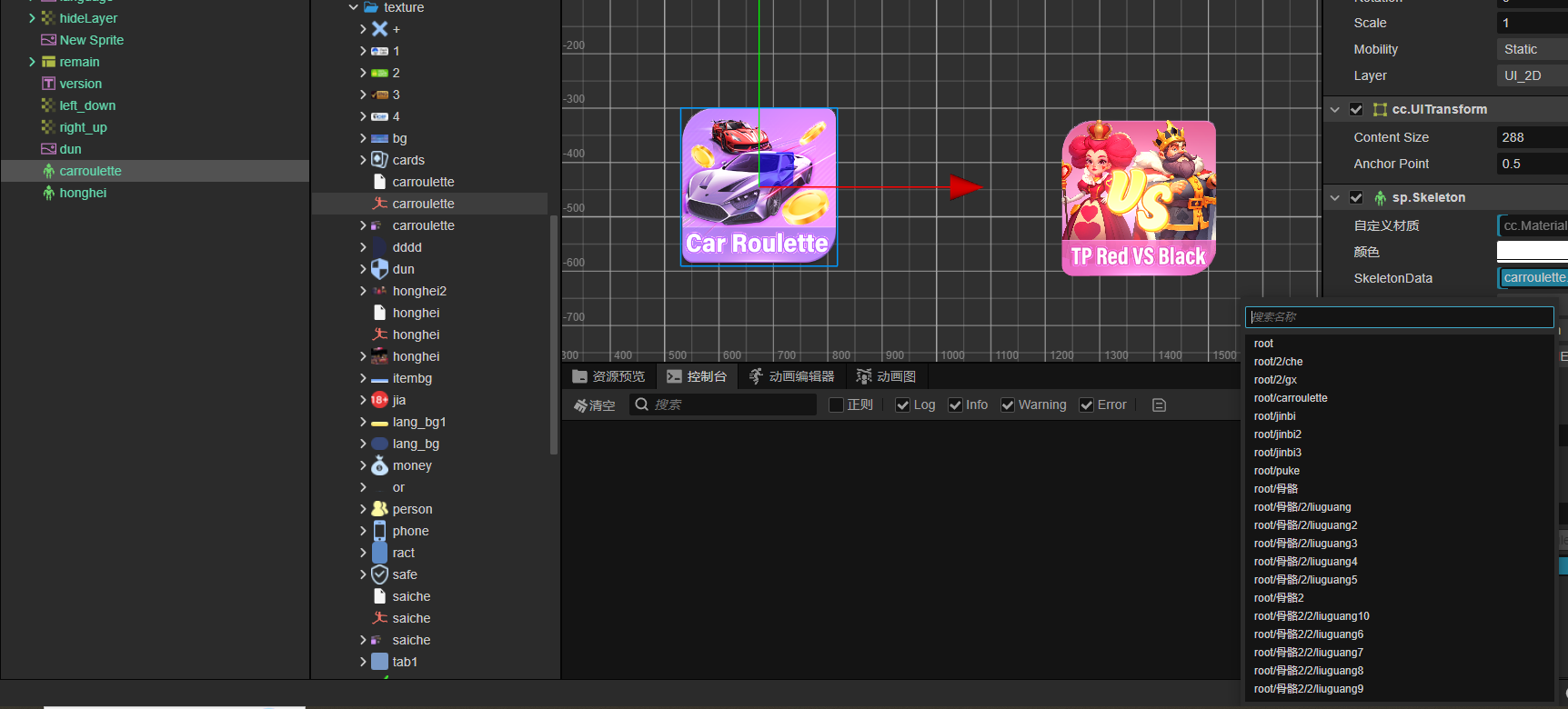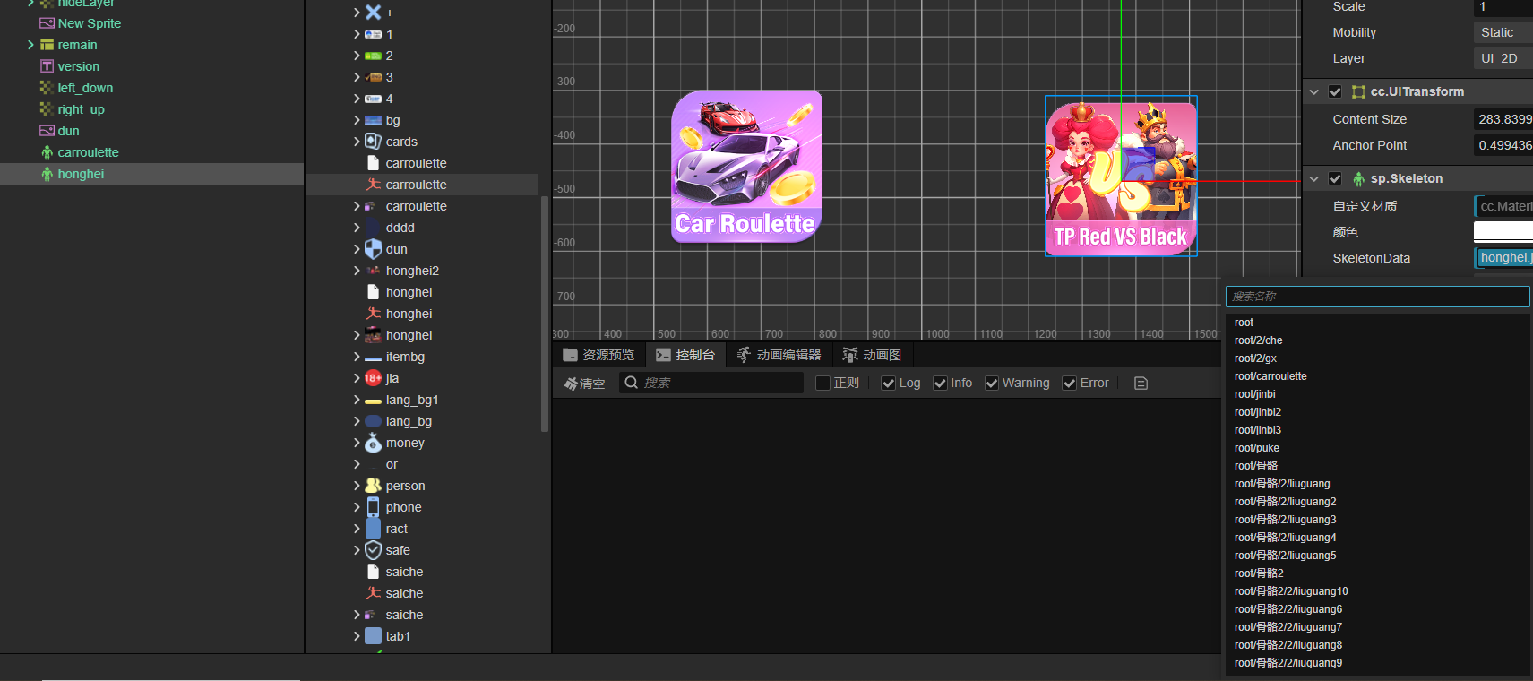 例如,准备两个不同的spine, 第一个spine 的插槽显示如下