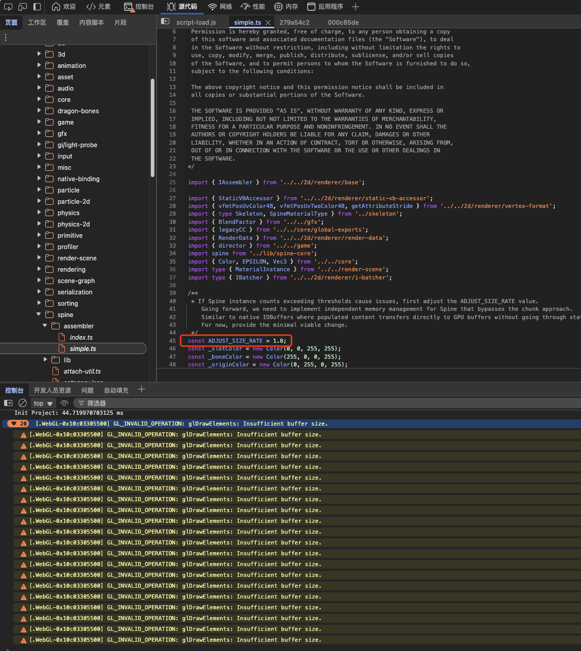 请先修改 spine/assembler/simple.ts ADJUST_SIZE_RATE 这个值调大点,可以调1.5看下,我试过1.8没有报错。这个之前是为了修复多个实例合批引入的。会再下个版本修复