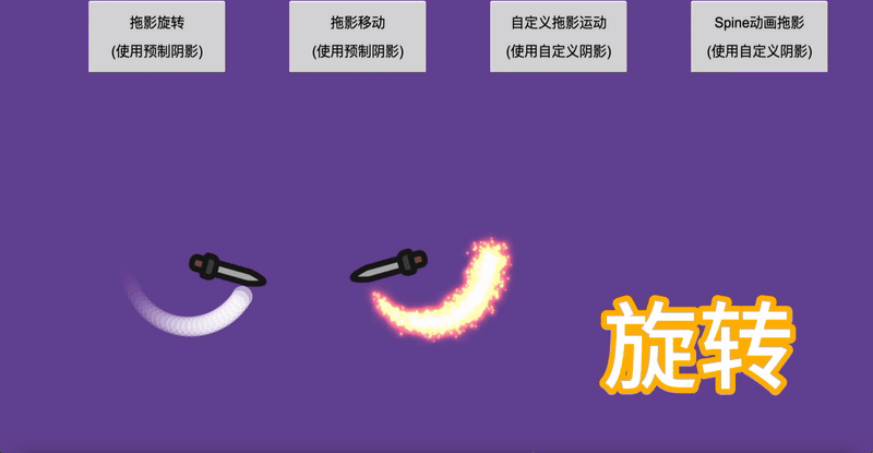 通过以上三步就完成了残影效果的配置,如果想查看效果,切记还要让目标节点运动起来,为此可以直接使用内置的rotate或者move组件。于是,你就可以得到类似于上面的残影效果了。