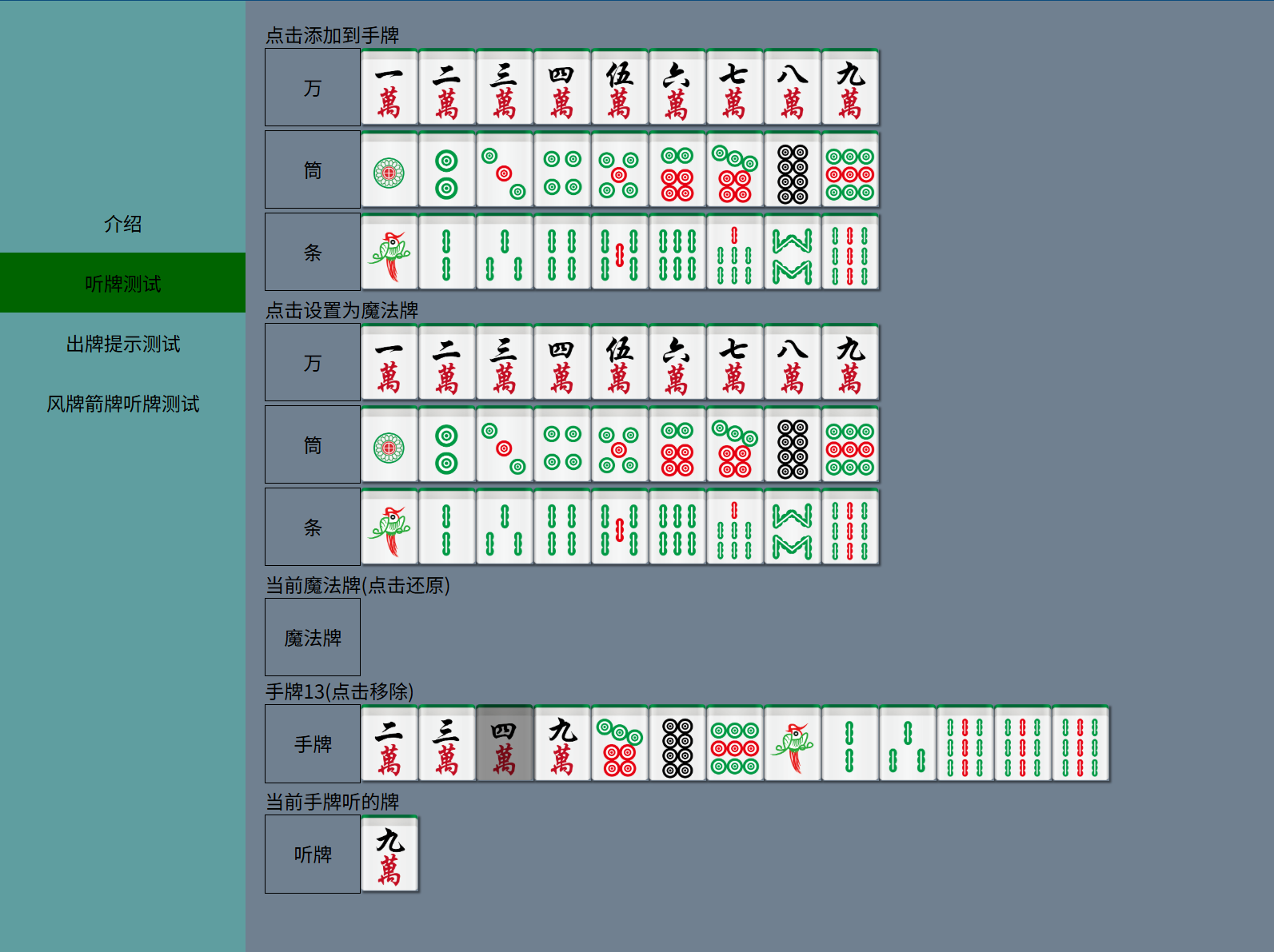 自己写的一个mj听牌算法,支持出牌提示、听牌判断、判断能否胡牌。去年在一家qp(正规的)公司上班,利用空闲时间写了这样一个算法,后面离职又给优化了一下,现在分享出来(毕竟代码得运行起来才能发挥它的价值),有需要的可以自己看看