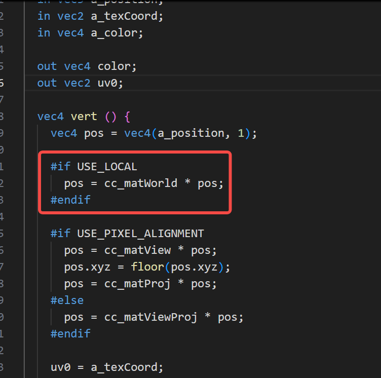 如图这个USE_LOCAL里面,pos取到的数据还是世界坐标,有没有什么方式是可以在shader里面拿到模型坐标的。我用cc_matWorld转换逆矩阵,也取不到正确的模型坐标,感觉cc_matWorld没有数据一样