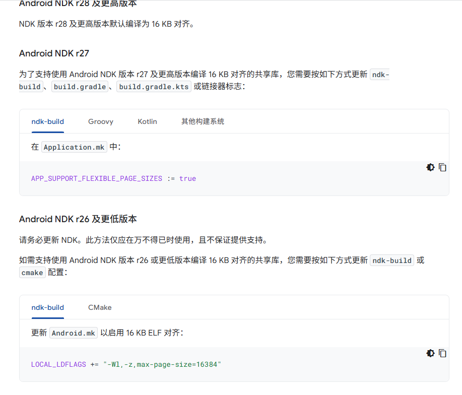 google参考文档:https://developer.android.com/guide/practices/page-sizes?hl=zh-cn#compile-16-kb-alignment