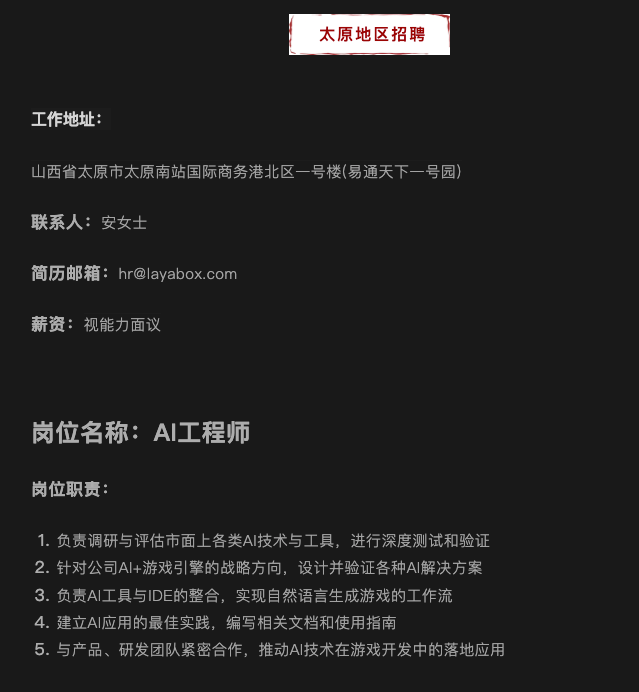 laya都开始招聘专门的岗位:AI游戏开发工程师,游戏组件开发工程师(开发不同品类游戏的专用组件),好硬的岗位啊,laya是不是打算听劝,开始从开发者痛点下手了