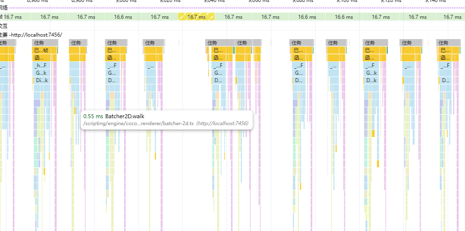 经过一些优化之后,现在每一帧的耗时都控制在13ms内了,但是依然会有顿一下的情况。