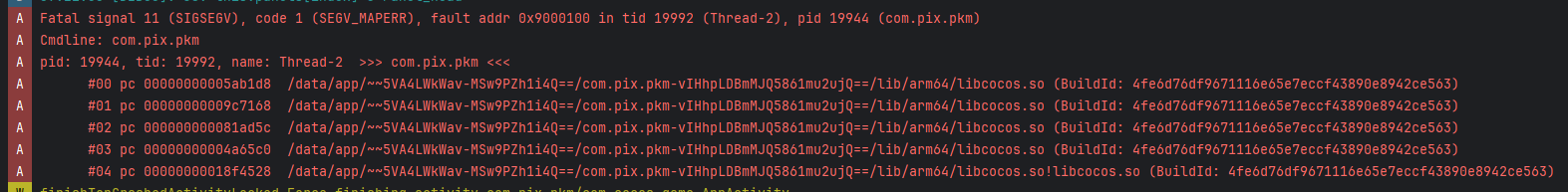 2025-05-19 09:21:56.923 20531-20531 DEBUG crash_dump64 A #04 pc 00000000018f4528 /data/app/~~5VA4LWkWav-MSw9PZh1i4Q==/com.pix.pkm-vIHhpLDBmMJQ5861mu2ujQ==/lib/arm64/libcocos.so!libcocos.so (BuildId: 4fe6d76df9671116e65e7eccf43890e8942ce563)