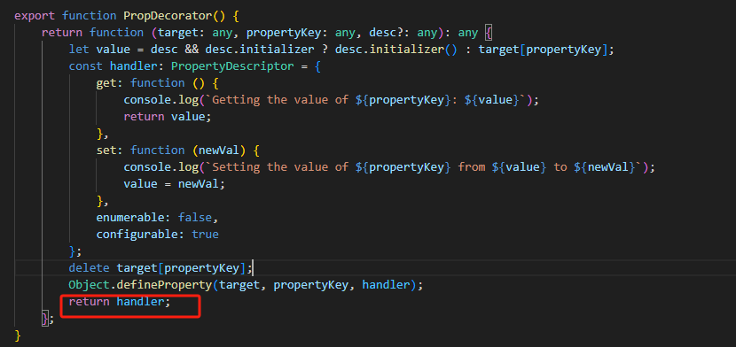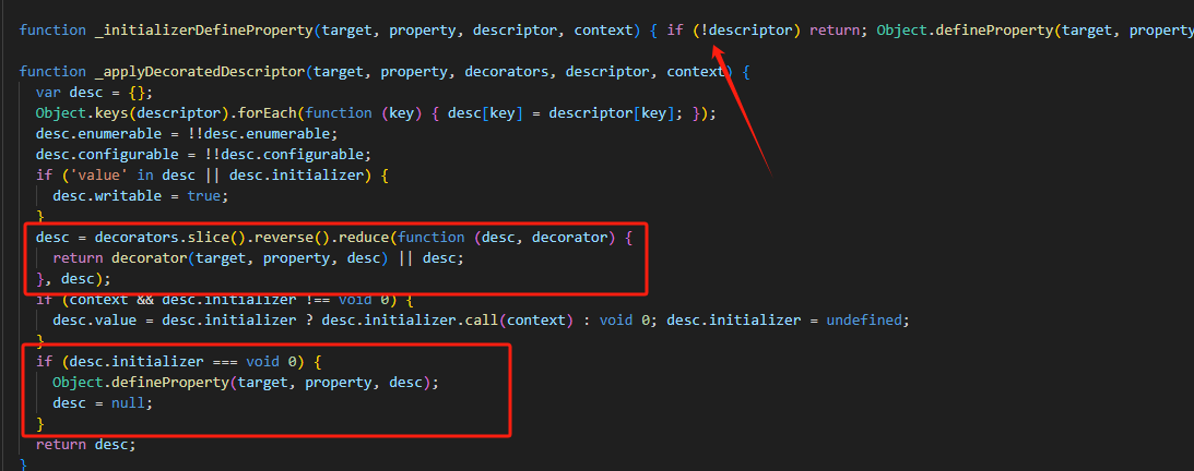 解决方式2、通过理清其原理,只要在属性装饰器返回一个不携带"initializer"的装饰对象即可防止"_initializerDefineProperty"又对实例对象添加属性,实现方式一行return即可: