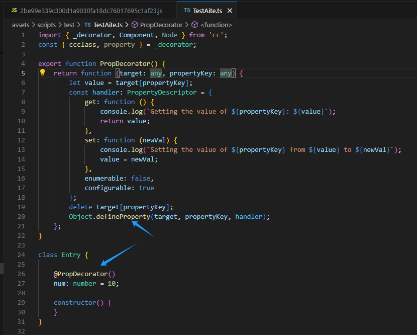 属性装饰器本身能用的,cocos自带的“@property”不就是嘛,只不过部分功能会有些出入,目前3.x版本应该都有这问题——如果你的属性装饰器内携带了“Object.defineProperty”,会发现其不生效。出问题的原因已经有人说过了,babel的版本问题。这里看示例图比较明显: