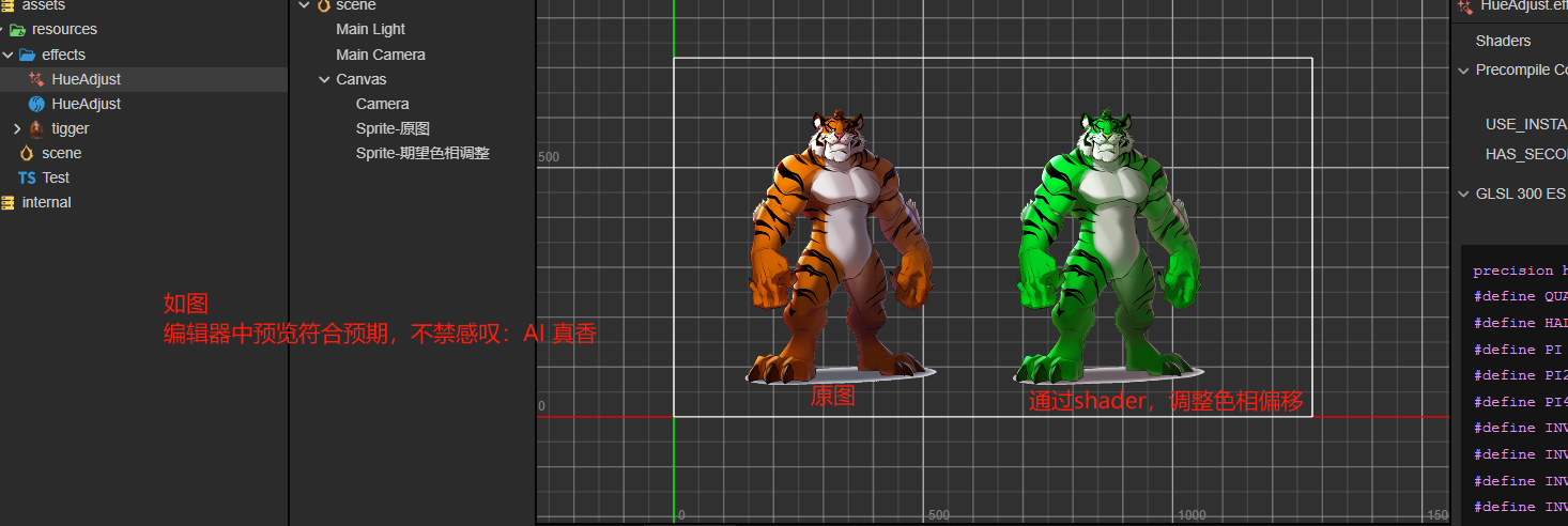 近期想试试AI搞一些平时用得少的东西,比如通过shader来修改色相。于是AI三下五除二就写了个,还不错。编辑器中预览符合预期,