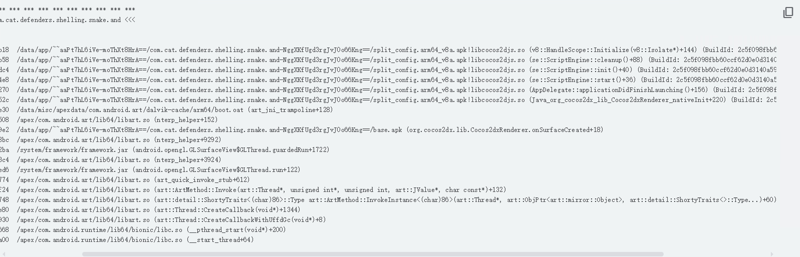 #05 pc 0x0000000000ac452c /data/app/~~aaPt7hL6iVe-moThXt8HrA==/com.cat.defenders.shelling.snake.and-NggXKfUgd3rgJvJ0o66Kng==/split_config.arm64_v8a.apk!libcocos2djs.so (Java_org_cocos2dx_lib_Cocos2dxRenderer_nativeInit+220) (BuildId: 2c5f098fbb60ccf62d0e0d3140a59834c575e01b)