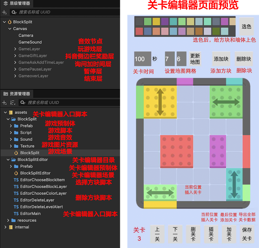 CocosCreator3.8,2D游戏,包含两个场景:游戏场景、关卡编辑器场景。