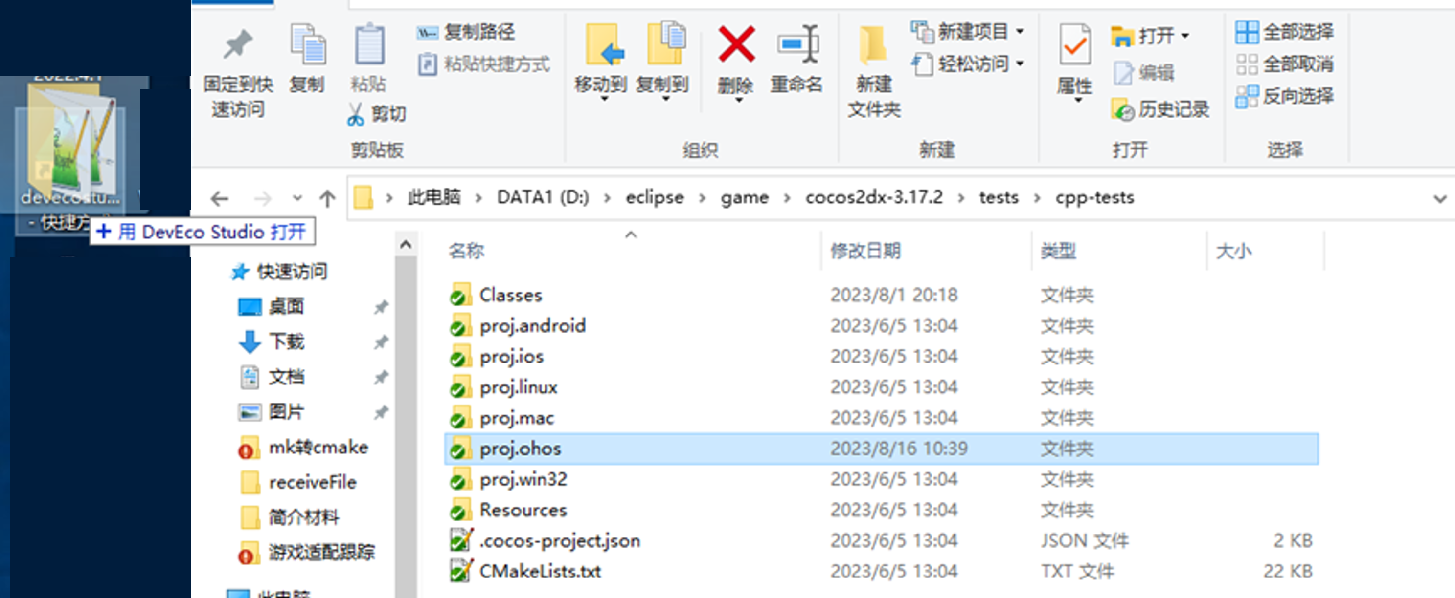将tests/cpp-tests/proj.ohos拖拽到Deveco Studio图标。