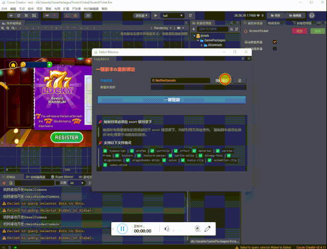 复制目录下所有文件,包括场景、预制体、纹理、动效、骨骼动画、字体等。并且重新生成uuid,在新目录下场景和预制体等重新绑定UUID,完美可用。