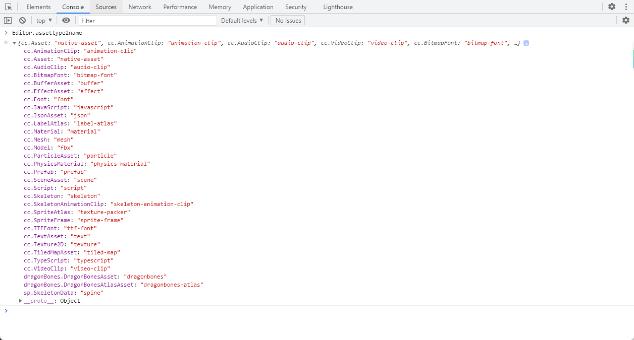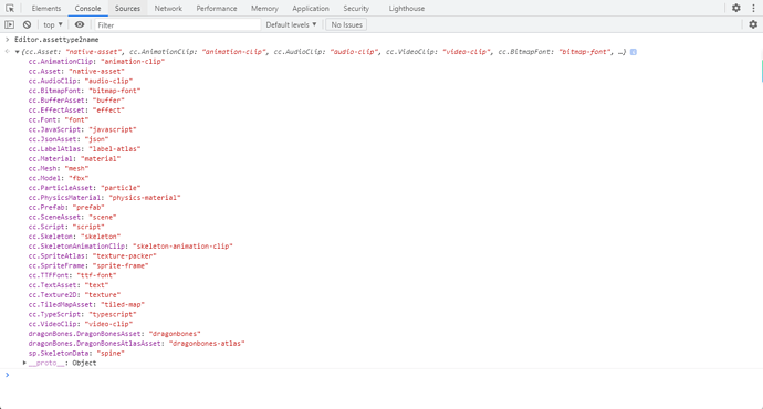 我们可以通过ctrl+shift+i 打开编辑器 开发者工具,输入Editor.assettype2name