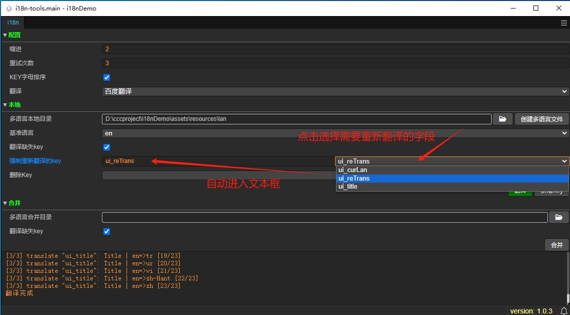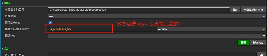 5.但是使用翻译毕竟会有翻译不达意的地方可以使用【强制重新翻译key】的功能,同样是选择key即可,会自动进入选择文本框的