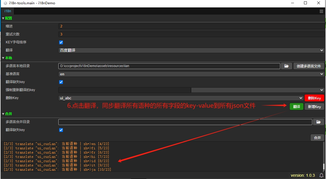 4.初步录入一个语种的key和文本之后可以直接点翻译,就能将文本通过api适配到所有语种(语种越多耗时越长)