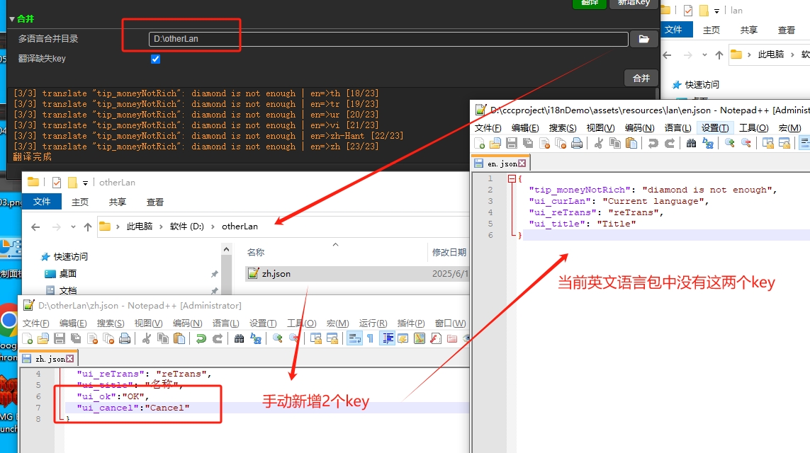 说一下我司关于多语言的情况,客户端有2名都存在可能要修改多语言的情况,但是我这边才是打包机所在,同事修改的文本都需要同步到我这边,但是又不想直接同步没完成的功能编写的代码,但又需要在测试环境看到临时修改的功能和多语言文本,所以就需要让同事能直接负责他自己的多语言文本即可。(我司目前是使用专门的EN.ts文件来负责本地调试运行时的多语言文本显示,线上环境是读取一整个语言包json文件中的值显示的,多语言文本是excel编辑后导出json的。我就需要频繁的更新excel文件和json文件,比较耽误编程的工作,因此想把这个部分的工作分离出来。)