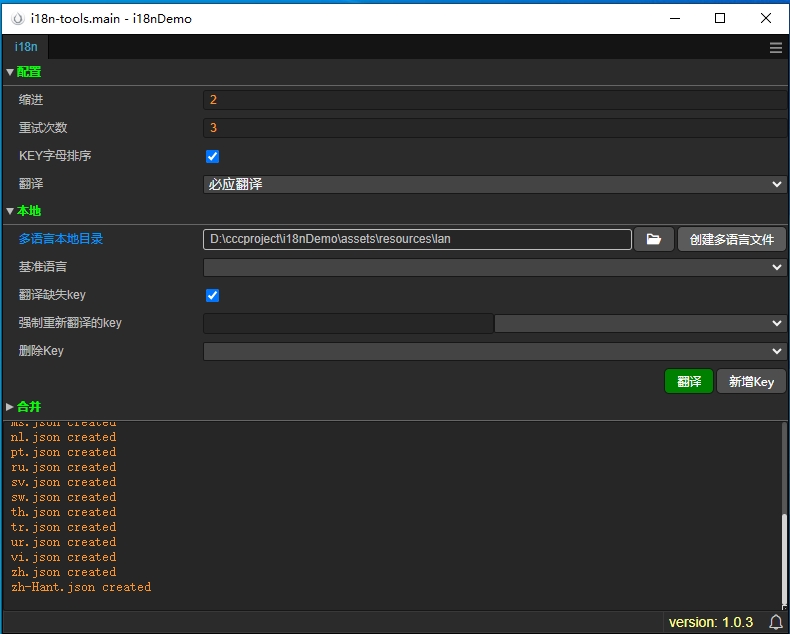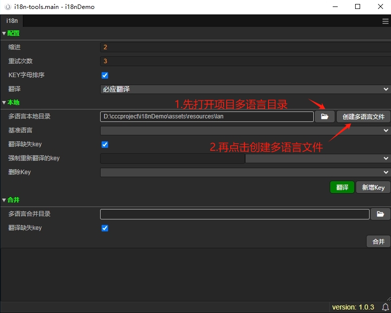 1.插件打开后主界面,先打开放置多语言文件的目录,再点击创建多语言文件,即可