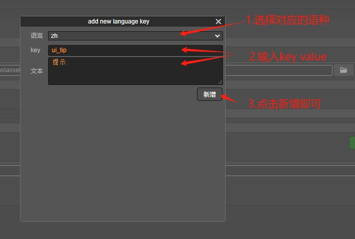 2.接下来新增一个key值,先确定一个基准语种(我选的是EN英文,新增语种种选的是zh简体中文),输入key和文本,再点击新增即可