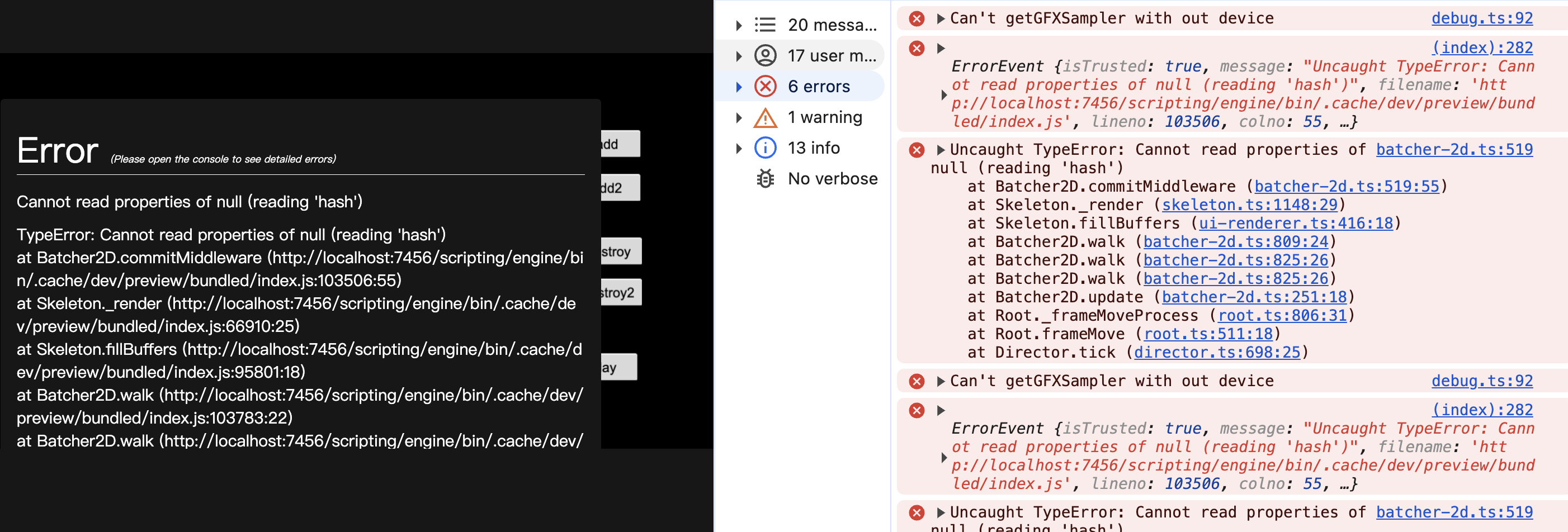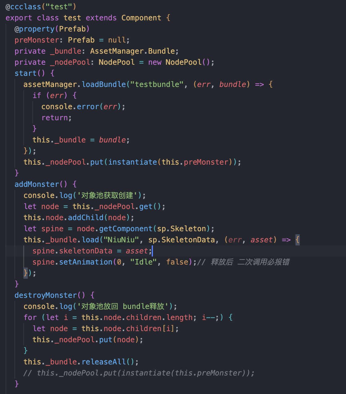 重现方式:对象池放进一个创建的含有spine组件的预制体 然后从 bundle 中加载sp.SkeletonData进行赋值, 关键点来了 这个时候调用spine.setAnimation(0, “Idle”, false); 然后将对象回收池子,bundle 释放资源,然后再次 从池子中拿出节点的时候 就会报错