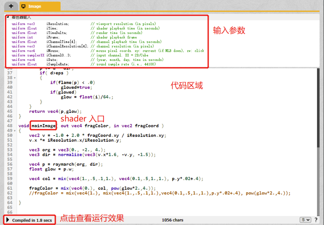 如下图所示,代码入口函数为:mainImage,红色框中为 Shader 所需要依赖的参数: