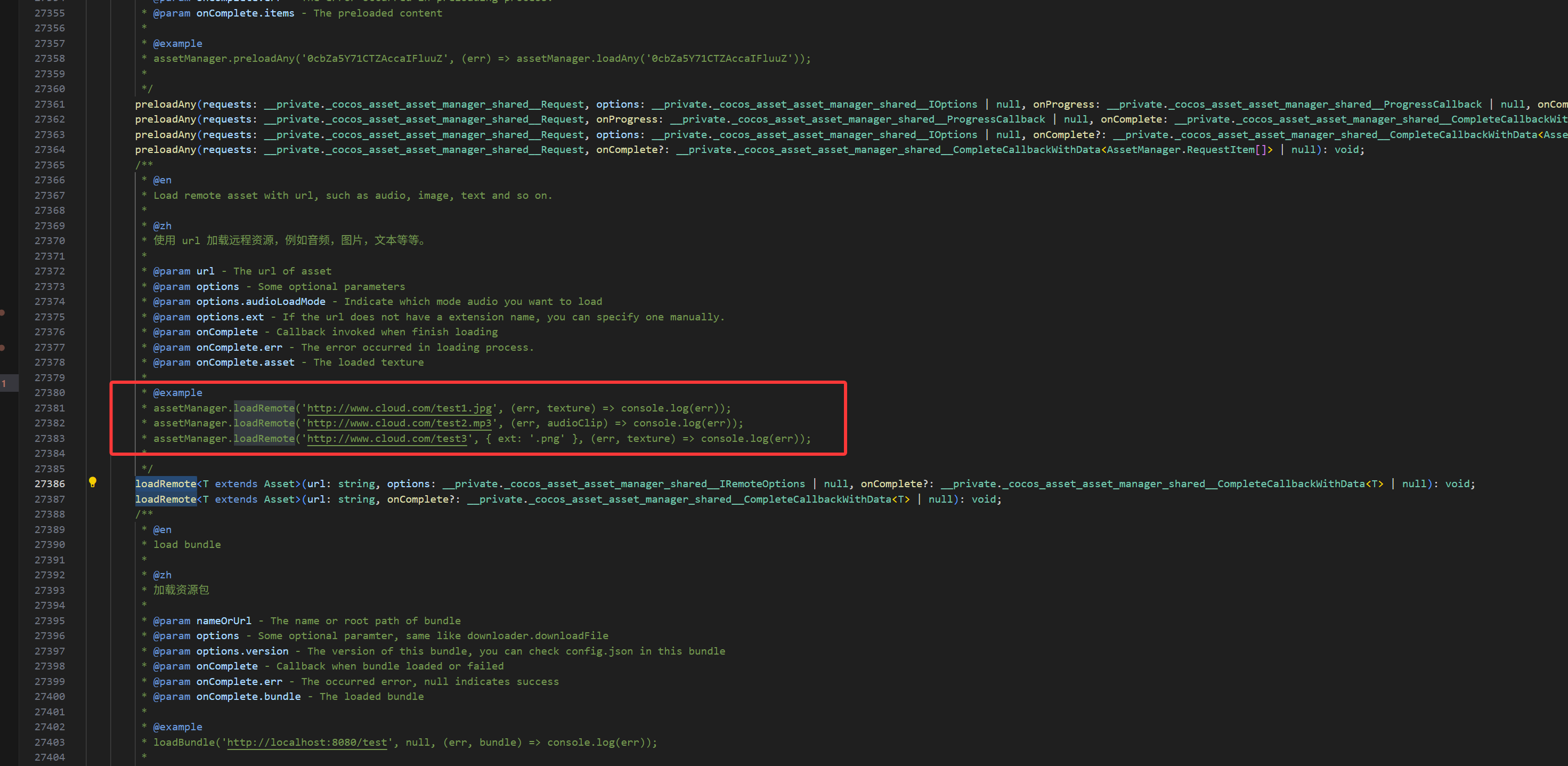 我有个需求,希望能加载远程资源的文件夹,查了一下Cocos 的 loadRemote 接口,好像只支持加载具体某个文件,不支持加载远程文件夹。如下图文档备注