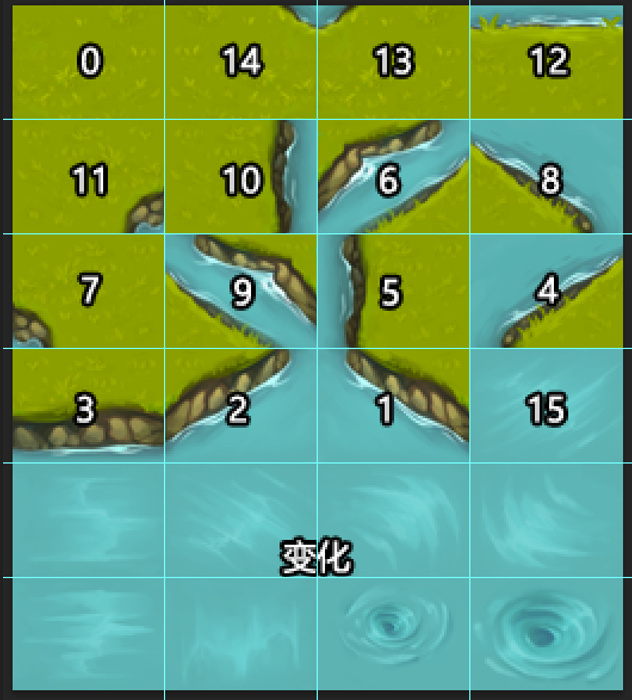 目前网络上有详细的原理和实现方式,所以这里就简单介绍一下:把相关联的地表块按下图编号,在拼接时按公式计算出需要替换和补齐的编号地块(地图摆放的顺序没关系,只要与地块编号对应就可以)