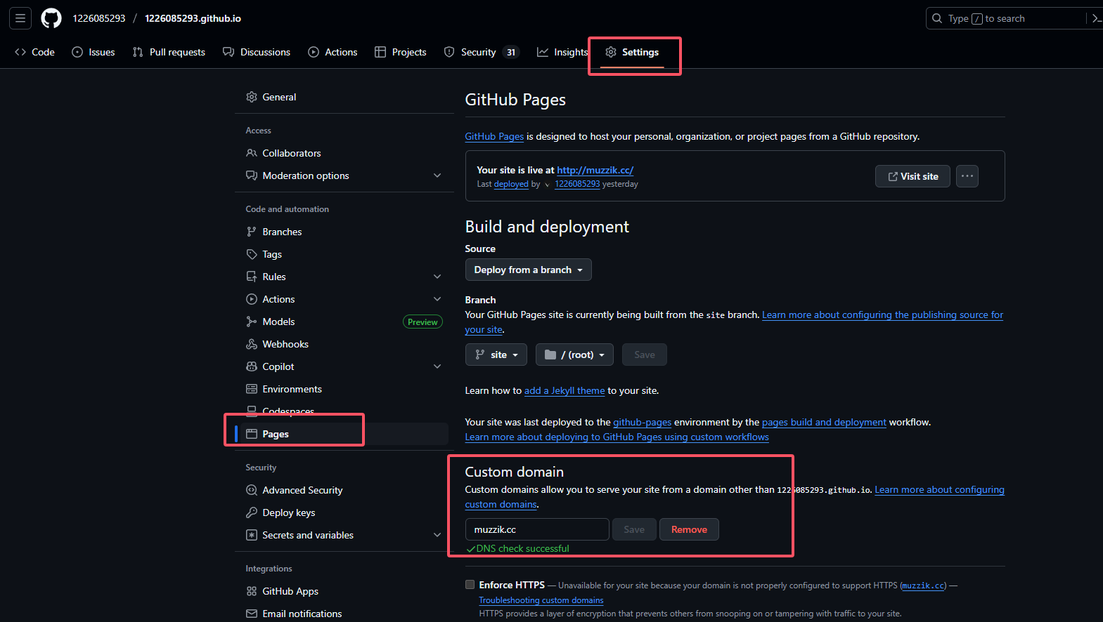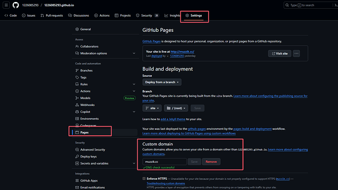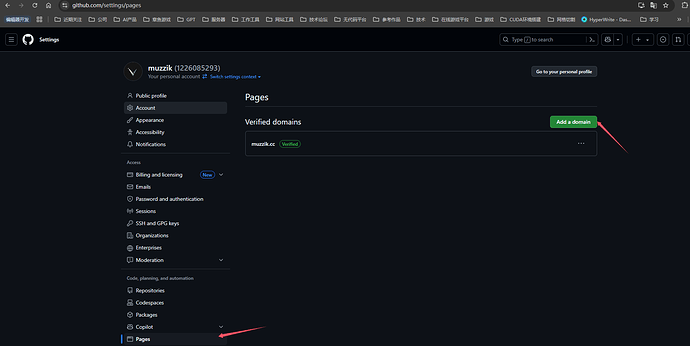 去 github 设置界面添加自己的域名并验证通过(验证不通过检查自己的 DNS 设置)