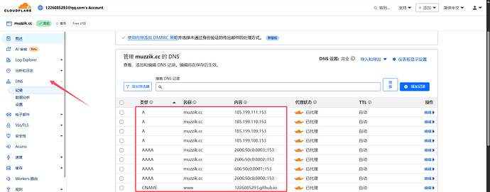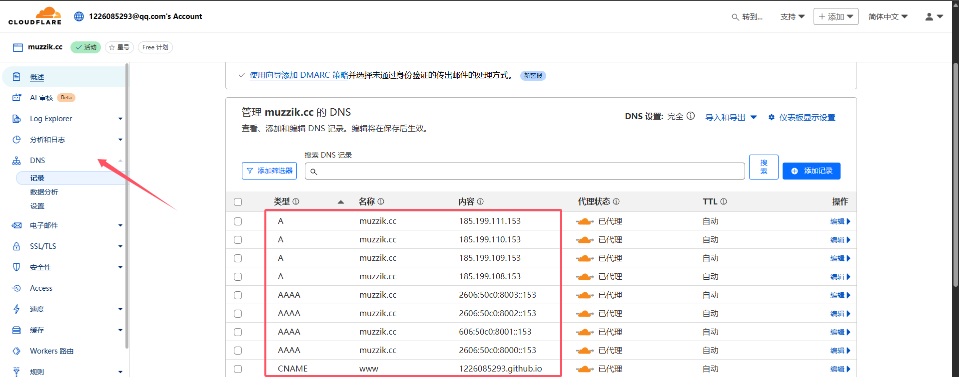 去 cloudflare 控制台左侧的 DNS 界面添加如下记录,