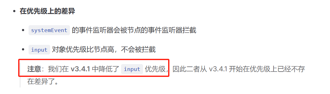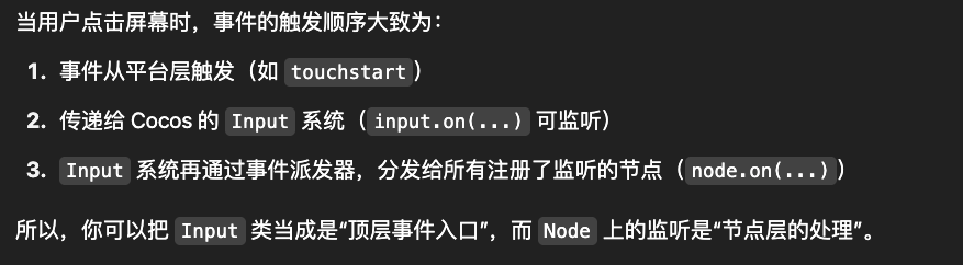 我的意思是:不能通过Input类型管理所有的输入事件吗?比如拦截任一节点的输入事件~我觉得这是不可能的事情,我不管他是什么层级,只要是能通过Input类,达到拦截node.on(touch)那就行了。我这边测试确实是通过input.on()是优先级低于node.on(),但是我的意思是:我不一定要用input.on来拦截,我自己随便在一个分发的函数里面就能拦截掉这个方法,所以说:Input类里面可以做到拦截任何的Input输入事件,其次就是我从来没用过input.on(),我用的全都是cc.game.on(),这不香吗?刚查了下,cc.game.on是天然无法监听touch事件的,也就是如果真的有拦截touch或者自定义touch的需求,那为啥不直接在最顶层来一个透明的层全局监听输入事件不就行了嘛?这样全部都是node.on了,更加不用区分谁的优先级更高了,一步到位,炫耀api的熟悉层度有什么优越感吗?