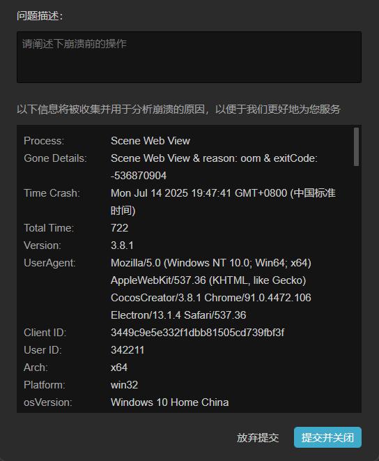 尝试使用3.8.2打开项目,仍旧同样的崩溃,感觉像是触发了chrome的什么bug
