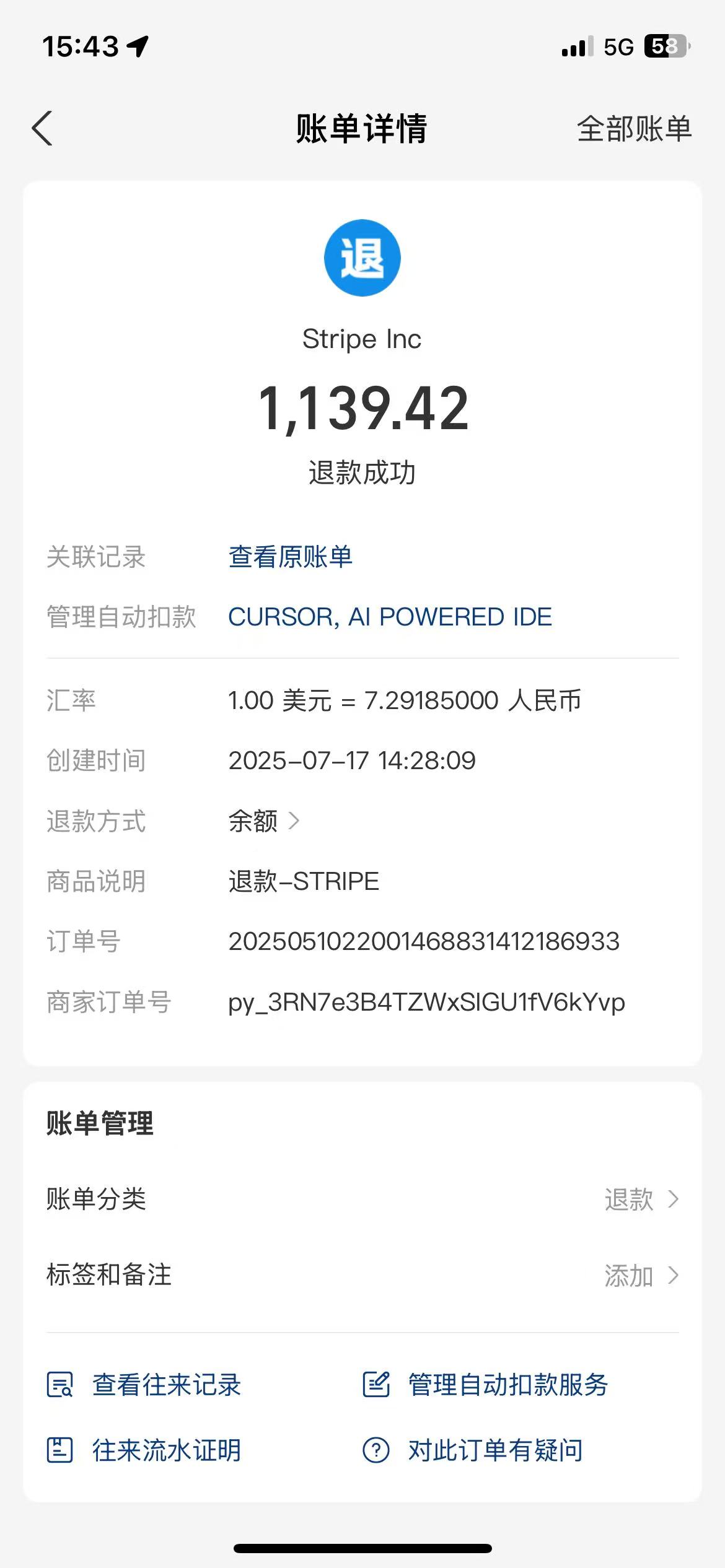 我也退款了,但是好像还没退回到我卡里面,不知道怎么回事,strip 是不是有什么间隔时间的?